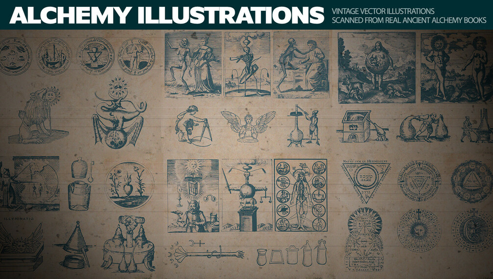 Scanned vintage illustrations, turned into vectors, from Ancient Alchemy books, some of them dating back to before the 14th century!